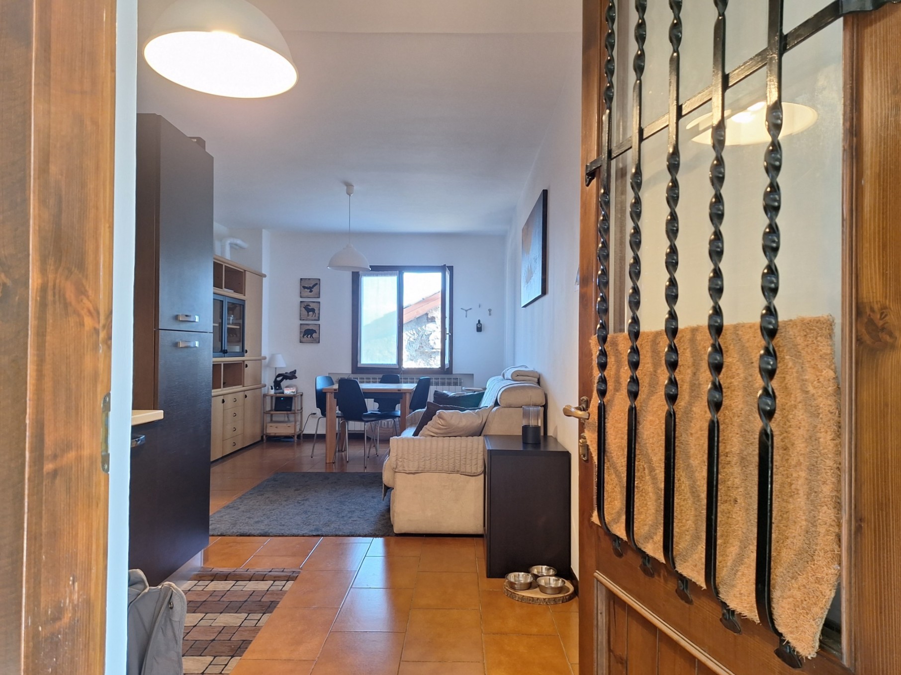 L’accesso avviene attraverso la corte del condominio. L’interno è composto da un ampio e luminoso soggiorno con cucina a vista, un disimpegno, un bagno dotato di lavatrice e doccia doppia, e due camere da letto.